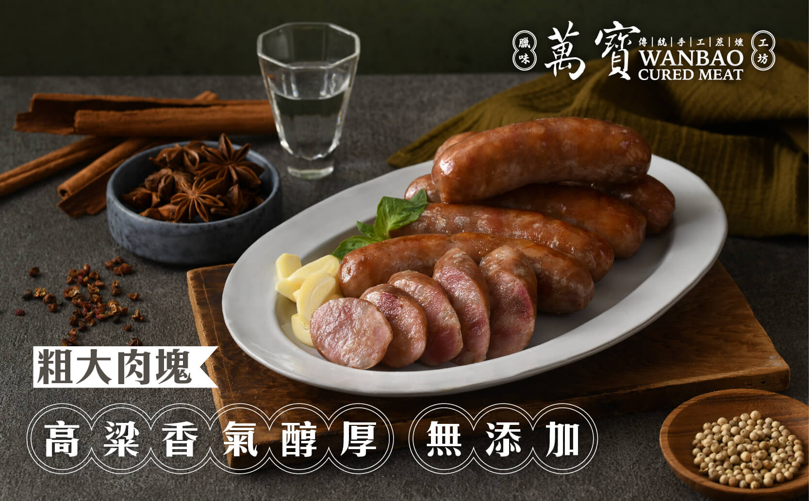 原 料:豬後腿肉、豬板油、天然豬腸、食用盬、肉桂、茴香、八角、甘草、糖、高粱酒、米酒、水、味精。